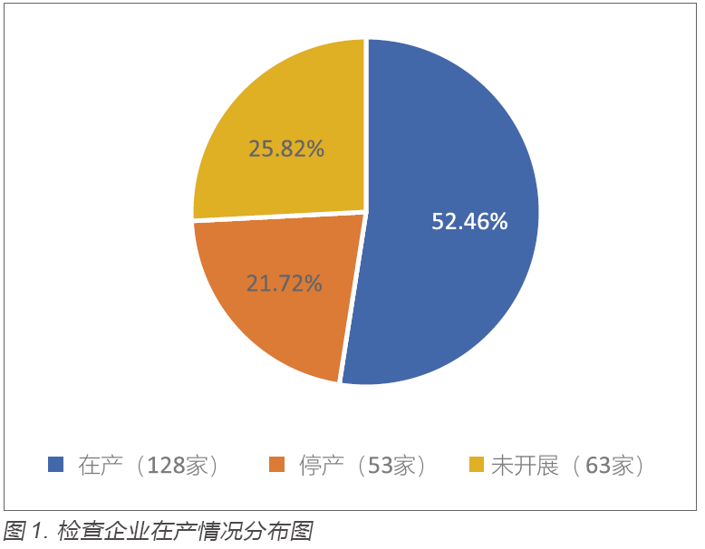 第一,在产企业占比较少,从“拿证”到产业化转化率不高。244 家企业中,检查时无人员,未开展检查的63 家,停产53 家,在产128 家,分布情况如图1 所示。开展检查的企业中,平均每家发现缺陷3.25 项。在产128 家企业中,所有受托生产企业均按要求开展生产放行,2 家注册人未按要求开展上市放行。