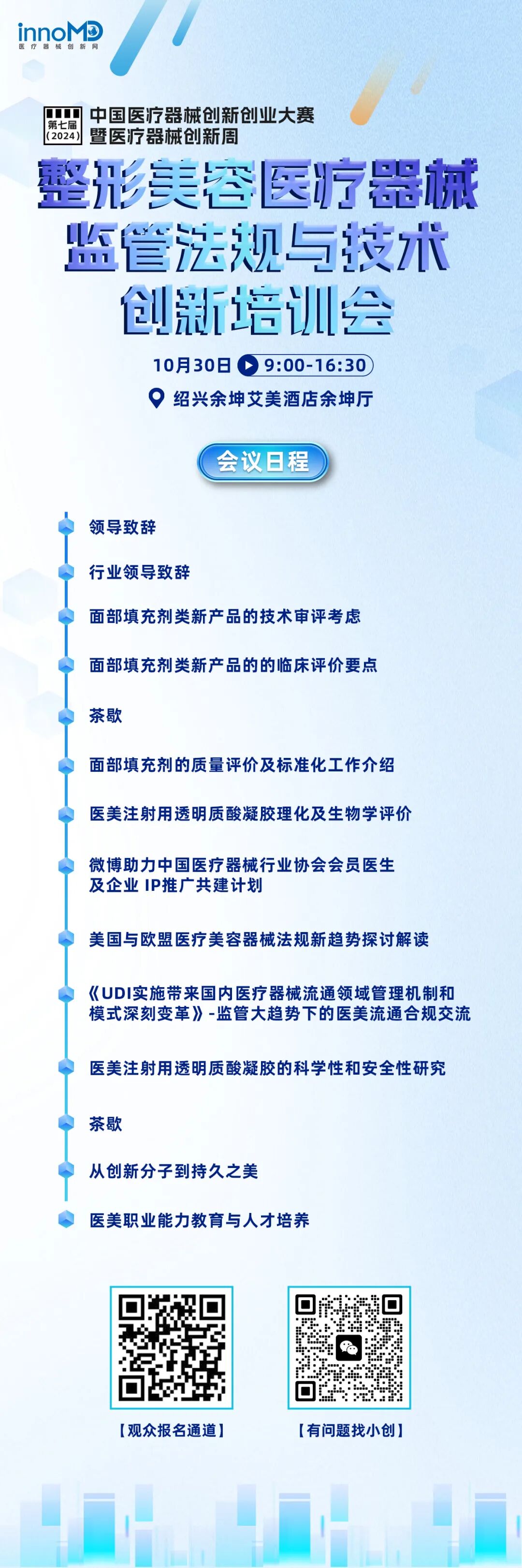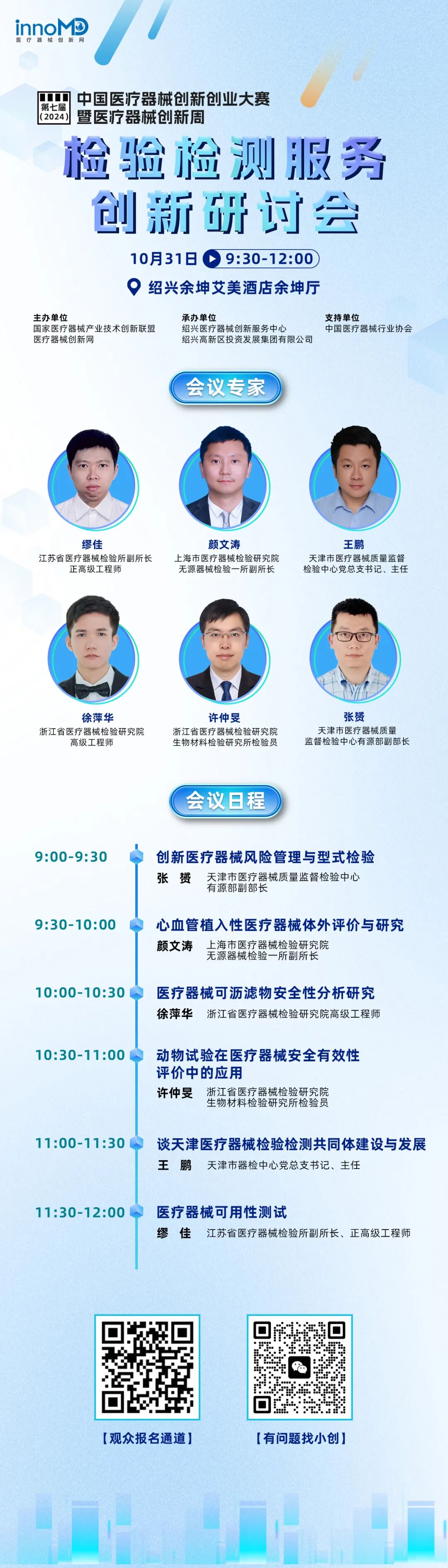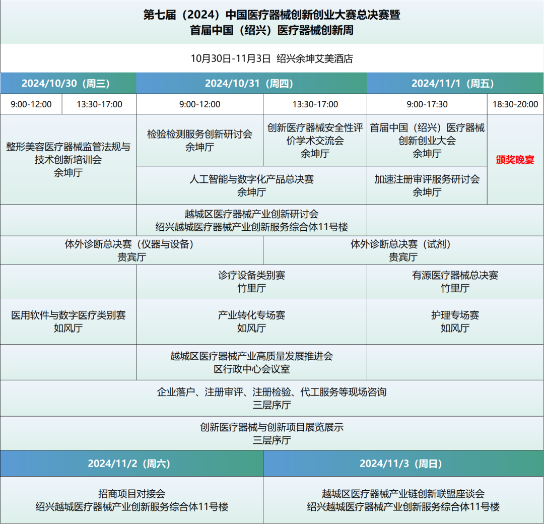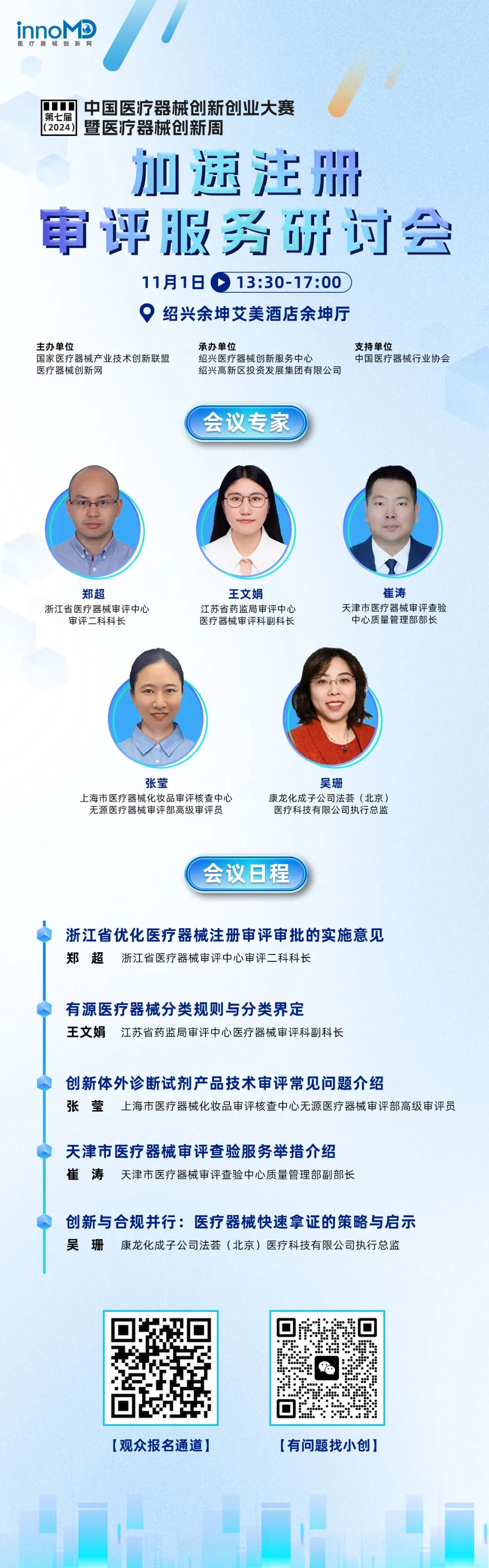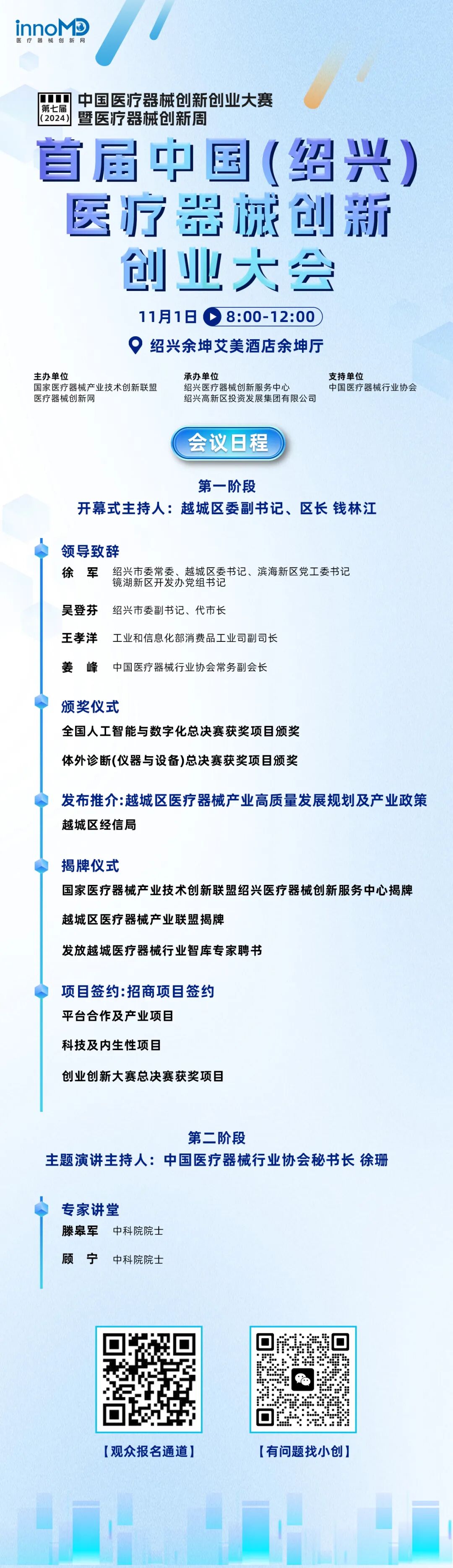 国务院令使传统招商政策转型、医械增长趋势放缓,医械企业聚集交流共谋创新发展之势迫在眉睫。第七届(2024)中国医疗器械创新创业大赛总决赛暨首届中国(绍兴)医疗器械创新周系列活动,一赛一展及多个专业论坛,将于10月30-11月3日与您相约绍兴!