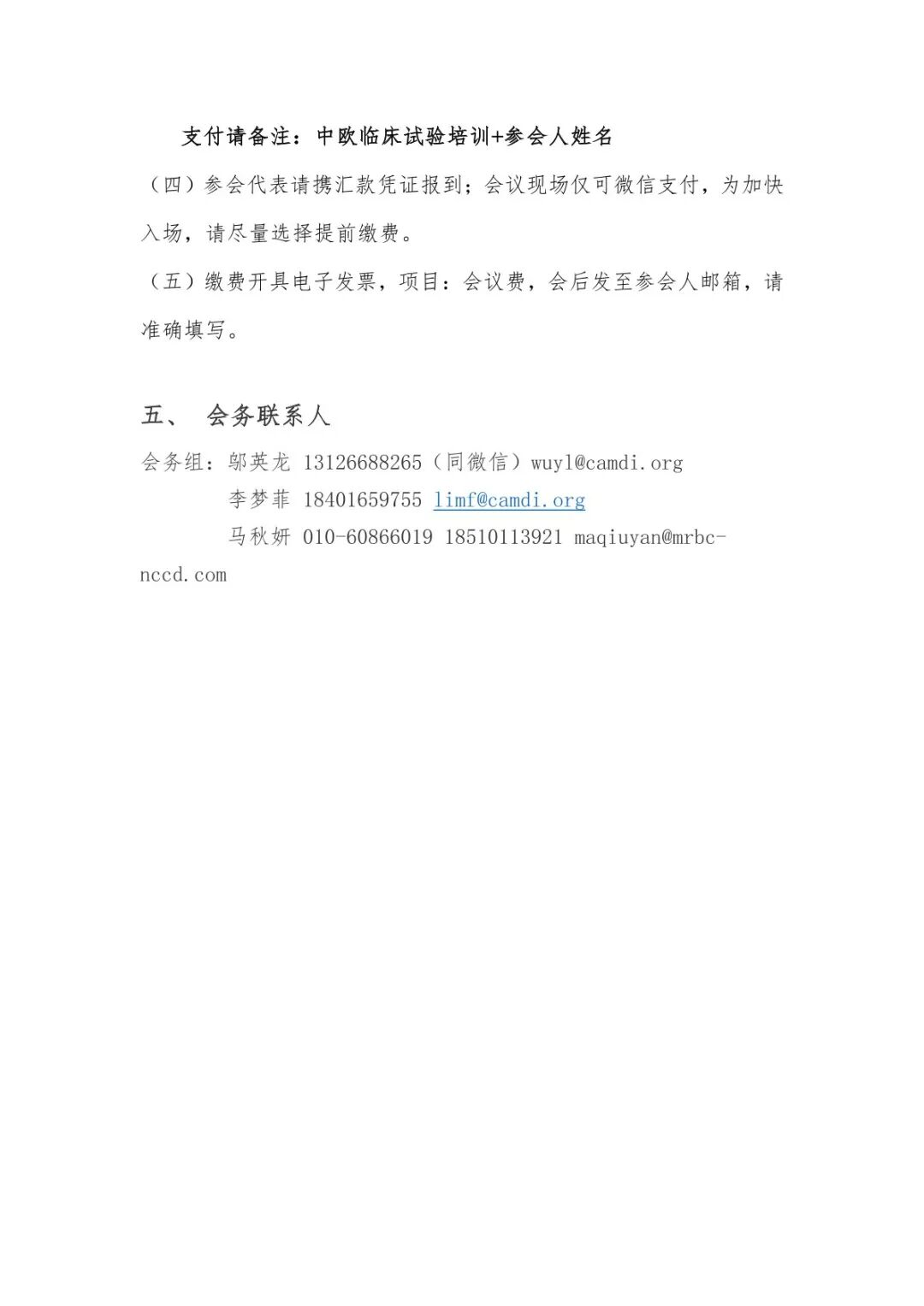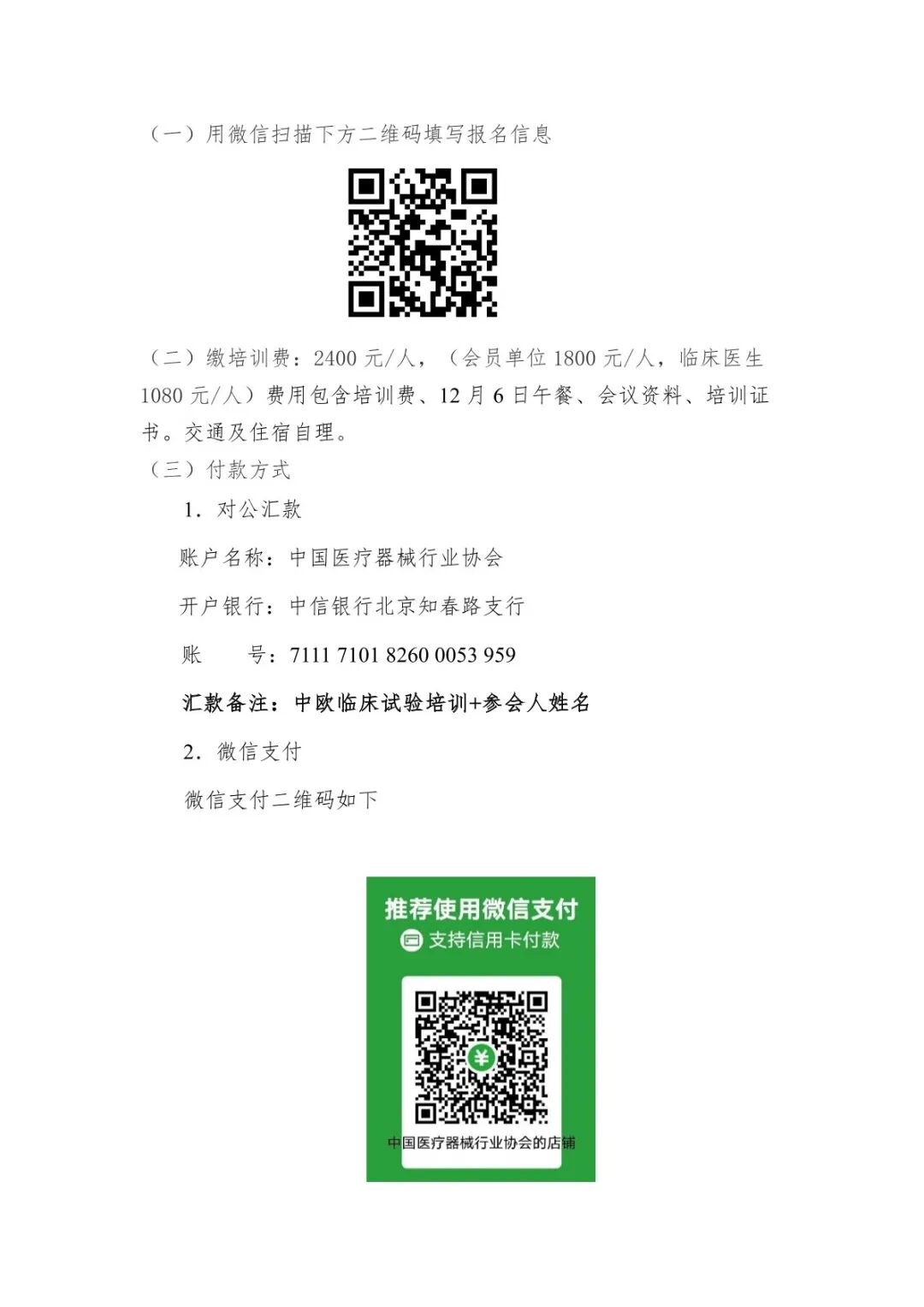 (二)缴培训费:2400元/人,(会员单位1800元/人,临床医生1080元/人)费用包含培训费、12月6日午餐、会议资料、培训证书。交通及住宿自理。参会代表住宿协议价:650元/间夜,请报“中欧临床试验培训”进行预定。订房请联系:18518017660 销售副总监王俊丽。账 号:7111 7101 8260 0053 959微信支付二维码如下