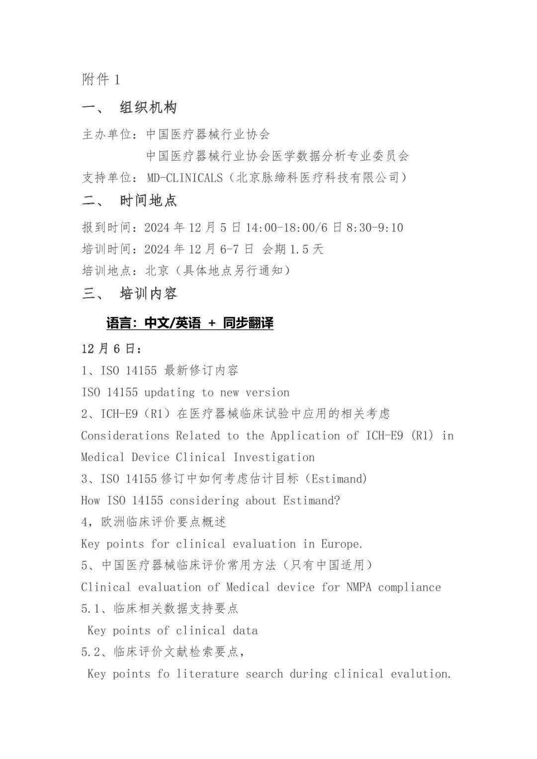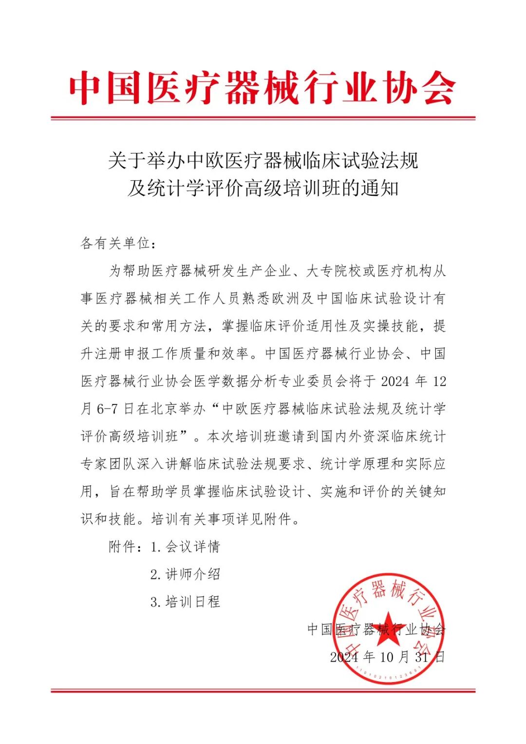 为帮助医疗器械研发生产企业、大专院校或医疗机构从事医疗器械相关工作人员熟悉欧洲及中国临床试验设计有关的要求和常用方法,掌握临床评价适用性及实操技能,提升注册申报工作质量和效率。中国医疗器械行业协会、中国医疗器械行业协会医学数据分析专业委员会将于2024年12月6-7日在北京举办“中欧医疗器械临床试验法规及统计学评价高级培训班”。本次培训班邀请到国内外资深临床统计专家团队深入讲解临床试验法规要求、统计学原理和实际应用,旨在帮助学员掌握临床试验设计、实施和评价的关键知识和技能。培训有关事项详情如下:中国医疗器械行业协会