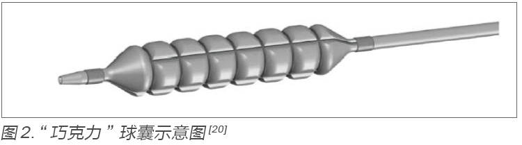 经皮腔内血管成形术中由于球囊在轴向的过度扩张以及纵向方向的剪切力等因素,常会造成限制性夹层等并发症[19]。约束型球囊扩张导管(也称巧克力球囊)具有金属丝约束结构,球囊扩张时形成枕部和凹槽部,可使球囊更加均匀地扩张(如图2所示)[20]。约束型球囊外部的金属丝扩张时不直接接触斑块,不具有刻痕和切割作用。在球囊充盈扩张时,无约束结构束缚的区域形成相对高压区,有约束结构束缚的区域形成相对低压区,从而产生一定的缓冲作用来减少球囊扩张对血管内膜的损伤,有效减少夹层的发生和补救支架的植入[21]。Chocolate上市后注册研究显示,262 例股腘动脉膝上病变患者未发生限制性夹层,支架补救率为1.6%[20]。研究者回顾分析了使用Chocolate与普通球囊预扩张对药物涂层球囊治疗股腘动脉疾病的影响,Chocolate组和普通球囊组各48 例、63 例患者,严重夹层发生率分别为4.2%、25%(P=0.003),支架补救率分别为2.1%、15.9%(P=0.016)[22]。